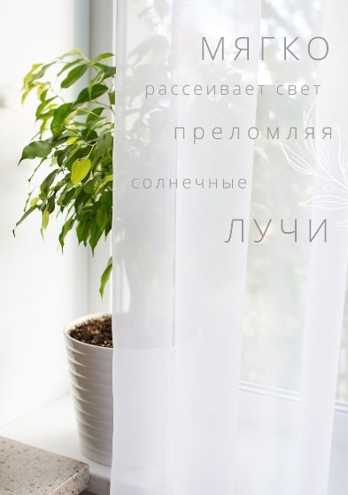 Le tissu fluide tient bien sa forme, ne se déforme pas après le lavage et se repasse facilement. Idéal pour créer un rideau aérien et doux.Peut être utilisé pour tout type de corniches (rond, profil, plafond). Dimensions : 300x250 cm Largeur des coutures latérales : 2x2 cm Prix : 1100 roubles.