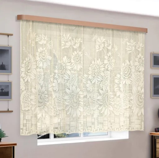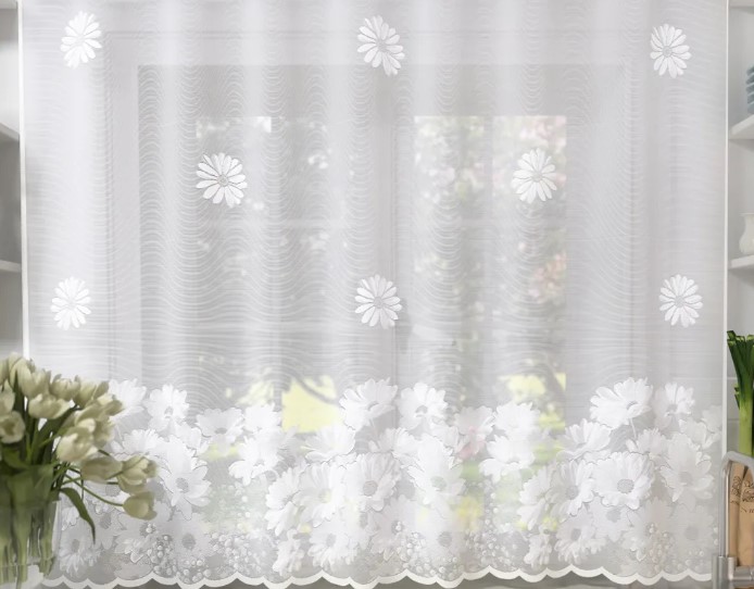 Beau tulle pour la cuisine d'un fabricant bien connu. Le tissu jacquard en polyester garantit une durabilité d'utilisation et aucune déformation. L'impression lumineuse et les motifs de fleurs volumineux s'intégreront dans n'importe quel intérieur de cuisine. Coût : 1270 roubles.