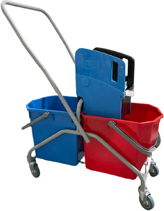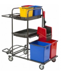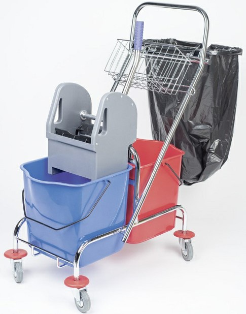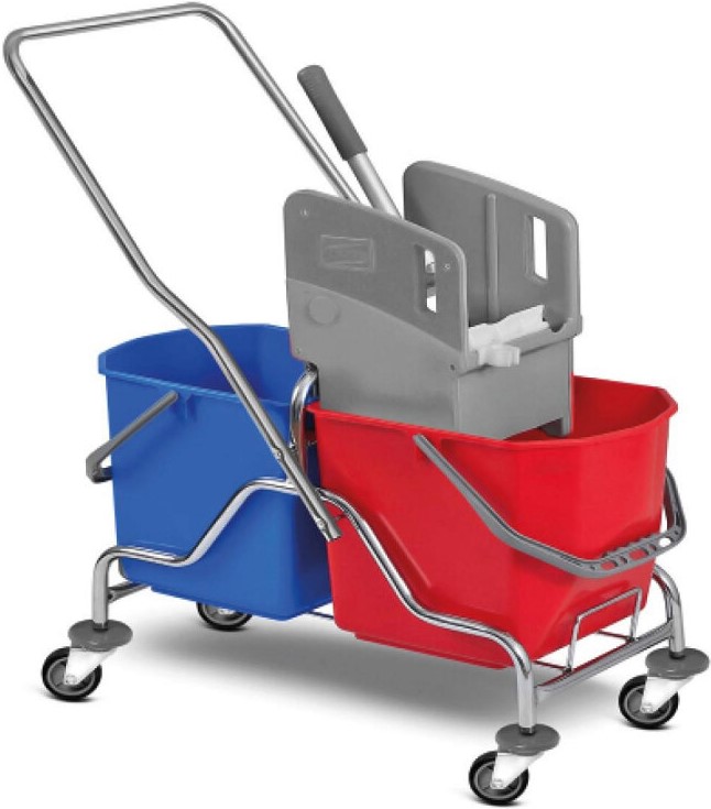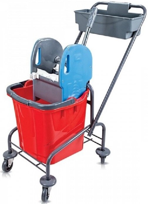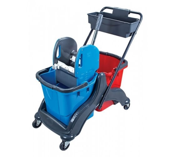 Chariot de nettoyage à 2 seaux de taille moyenne, parfait pour un entrepôt, un petit magasin ou un mini-hôtel. Dimensions : 110x75x132 cm Poids : 20,75 kg. Il est possible de commander en ligne dans la boutique en ligne en précisant la couleur du socle (rouge, jaune, bleu, gris). Le cadre est équipé d'un essoreur mécanique vertical, adapté aux toiles à boutonnières et aux vadrouilles. Coût moyen : 30639 roubles.