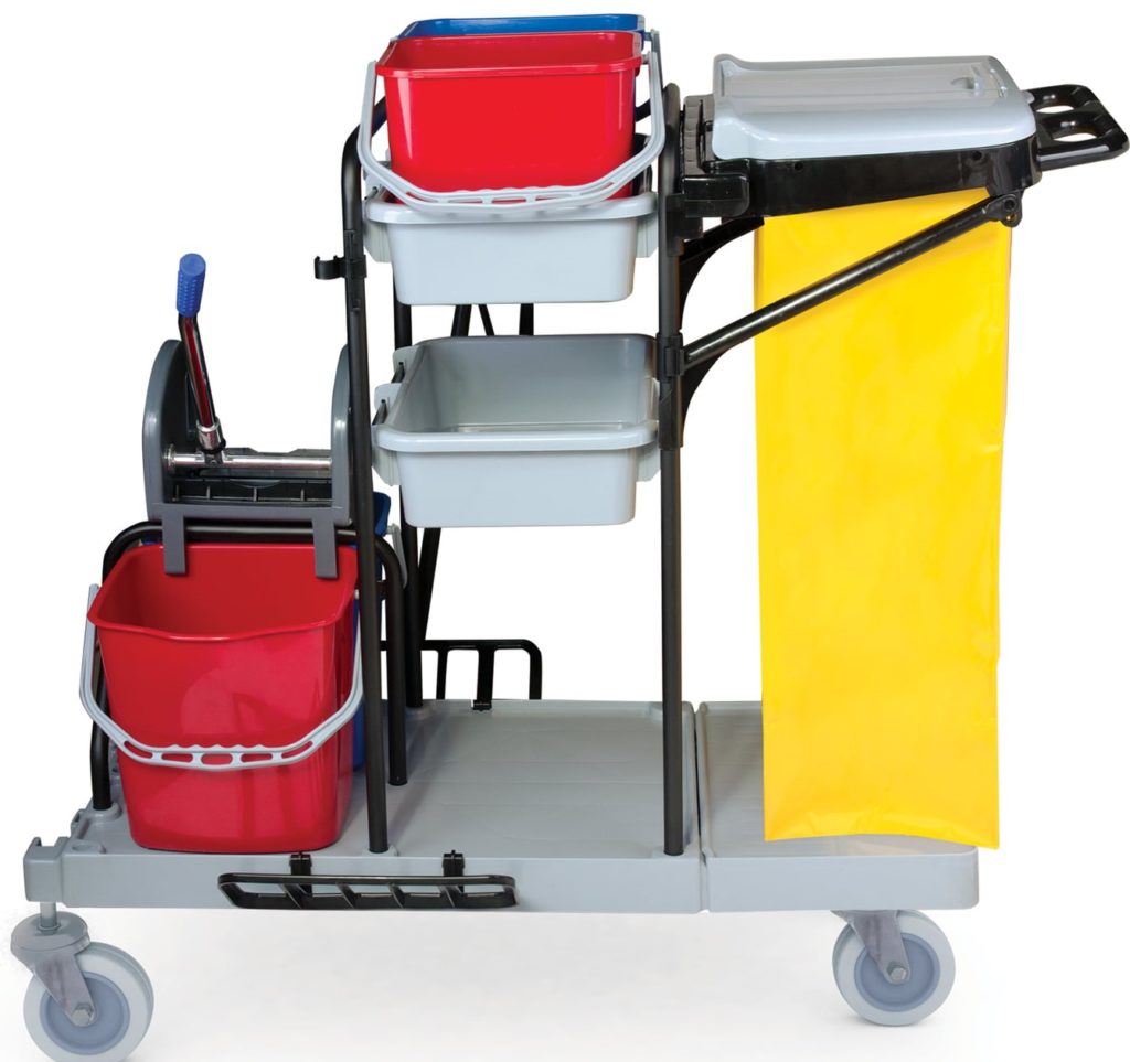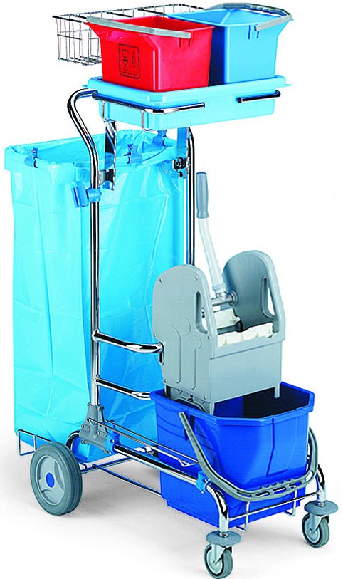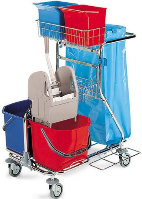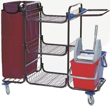 Les chariots de nettoyage sont une plate-forme plate en acier ou en plastique, sur laquelle se trouvent des conteneurs, des plateaux, des étagères pour les accessoires. Utilisé pour le traitement sec, humide et le service de chambre (livraison de linge de lit, serviettes).