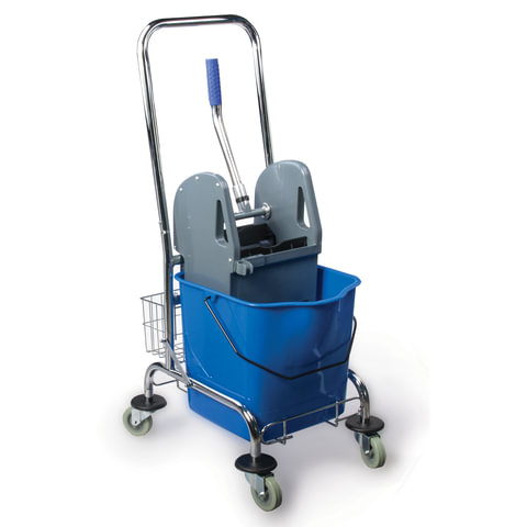 Le chariot avec une essoreuse verticale, les roues tournent à 360 degrés, le cadre est en métal durable. Une excellente option pour une pièce de taille moyenne. Les seaux de 25 litres en bleu et rouge, ont des marques de déplacement. Livré avec un porte-serpillière, il simplifie le travail. Dimensions du chariot : 32×92,5×63 cm Diamètre des roues : 7,5 cm Poids : 7,3 kg. Matériau du seau : plastique. Pays d'origine : Russie. Coût : 33371 roubles.