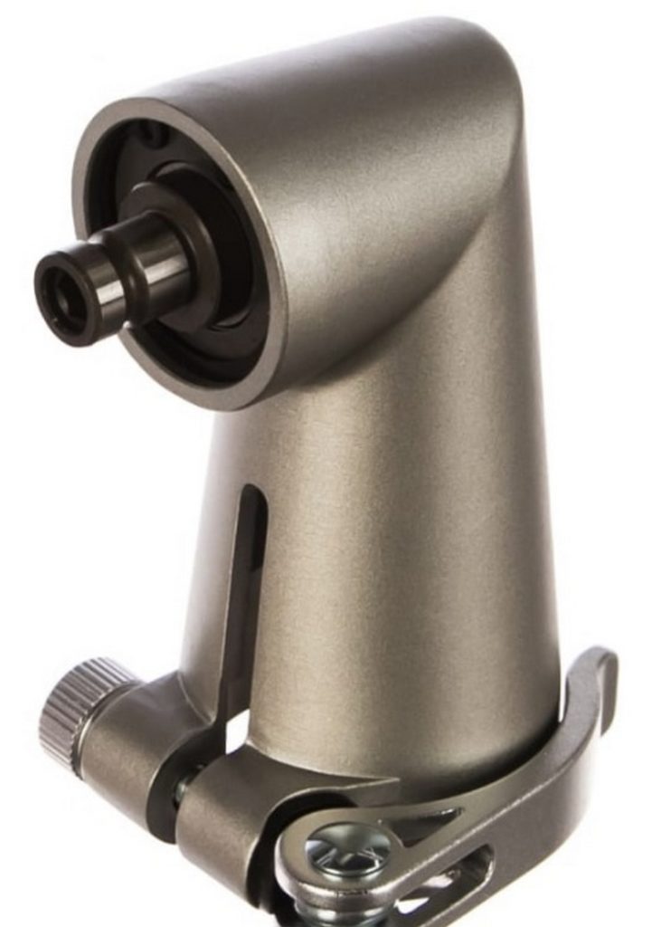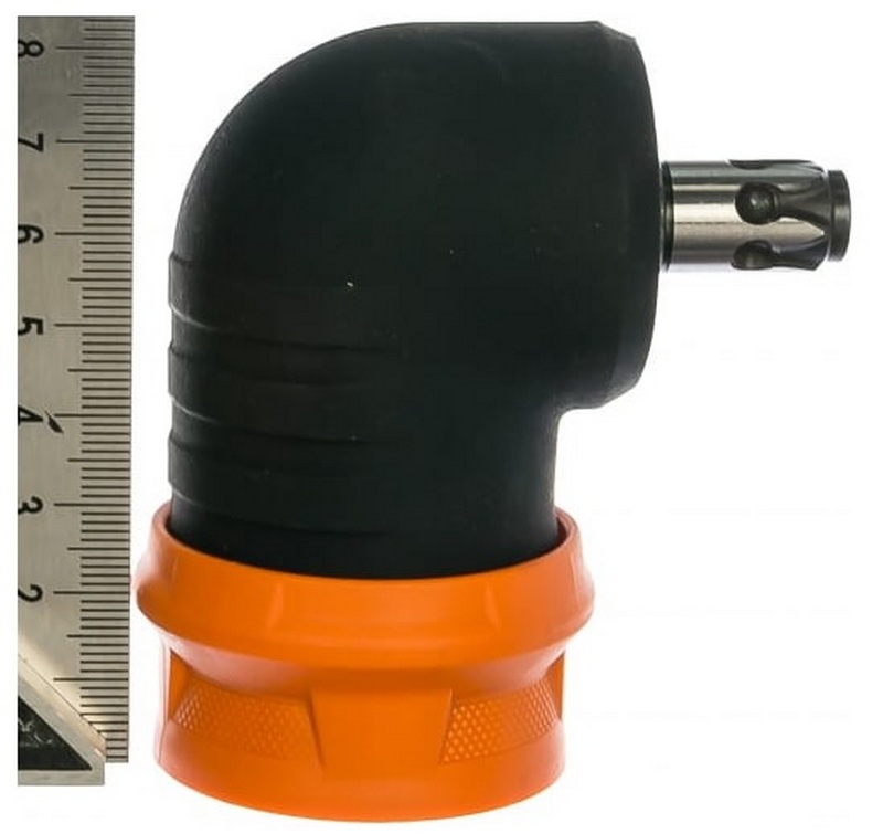 Il est conçu pour percer des trous / visser des fixations dans des endroits où il est impossible de positionner l'appareil de travail à un angle élargi habituel, c'est-à-dire dans des espaces confinés. Le corps de cette buse se caractérise par la présence d'éléments placés à un angle de 90 degrés. Dans le même temps, seule la broche d'entraînement est située à l'intérieur de l'adaptateur, avec la partie travaillante tenant la perceuse / mèche.