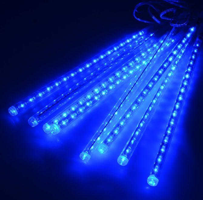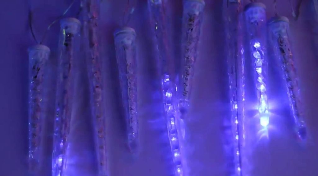 Le produit a la forme d'un cordon auquel sont attachés des segments identiques avec des LED. Pendant le fonctionnement, les ampoules s'allument en alternance, ce qui ressemble à des gouttelettes d'eau. La longueur du cordon est de 2 mètres, les segments sont de 1,5 mètre. Les LED de haute qualité ne chauffent pas même en cas d'utilisation prolongée. Les ampoules sont blanches, cependant, malgré cela, le modèle peut devenir une décoration unique pour la maison.