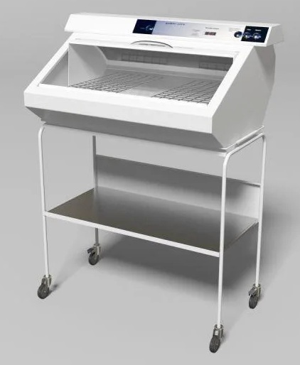 Caractéristiques de conception : système de contrôle électronique pour le maintien de la stérilité, supports sur roulettes, la conception de la boîte élimine la possibilité que des liquides pénètrent à l'intérieur pendant le nettoyage (solutions désinfectantes), la grille a une capacité 4 fois supérieure par rapport aux étagères avec une lampe UV.
