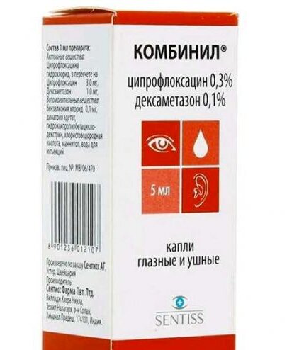 Une solution de couleur blanche, jaune clair, se compose de ciprofloxacine (antibiotique), de dexaméthasone (glucocorticostéroïde synthétique). Le flacon est un compte-gouttes. Il a une action antibactérienne, anti-inflammatoire. Il est utilisé dans le traitement des maladies infectieuses des yeux, des oreilles :