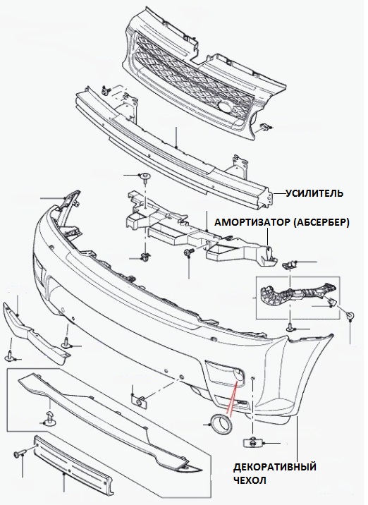 La couverture décorative peut se plier, elle ne résiste qu'aux chocs légers. Derrière, il y a un amortisseur (absorbeur). Cette pièce est en plastique et est conçue pour absorber l'énergie des dommages mineurs. Derrière l'amortisseur se trouve une armature rigide, souvent appelée amplificateur. Sa fixation est réalisée sur les guides du cadre, la pièce a une fiabilité considérable. Ces supports peuvent être des dispositifs hydrauliques complexes ou de simples structures métalliques conçues pour absorber les chocs.