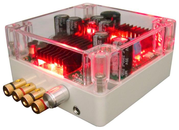 Ceci est un représentant des amplificateurs budgétaires. La puissance déclarée par le constructeur est de 110 watts. Possède 2 canaux. Diffère dans les petites tailles et le petit poids. Mais il a un design très original. À travers le haut transparent de l'étui, vous pouvez voir l'intégralité de la "farce", qui est surlignée en rouge. De couleur grise, les boutons de réglage sont de couleur or.