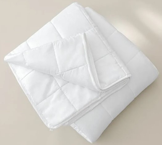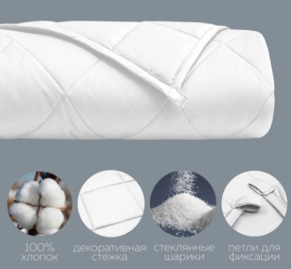 Version matelassée 100% coton, garnie uniformément de poids en billes de polyester et de silice. Les coutures sont faites qualitativement, ne s'étalent pas, les fils ne dépassent pas. On a l'impression d'être embrassé.Favorise un sommeil meilleur et plus sain. Il est recommandé de laver à la main ou sur une machine à écrire à une température ne dépassant pas 30 degrés. Prix : 7975 roubles.