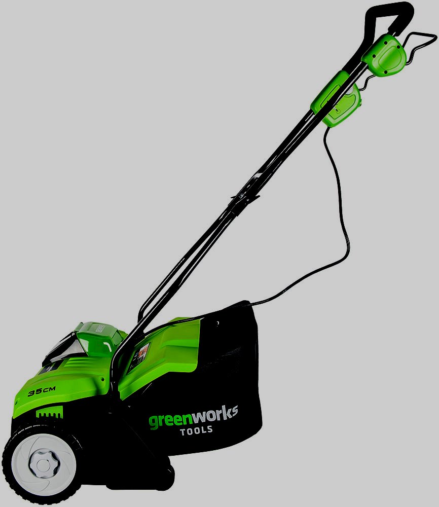 Les experts conseillent d'acheter un tel équipement si vous avez un petit jardin. Alimenté par une batterie électrique. La largeur de la bande biseautée est de 360 mm, ce qui rend l'appareil maniable. Poids du produit 11,7 kg. La profondeur du traitement est réglée manuellement, au moyen du système central à cinq niveaux. Le produit appartient à la catégorie des universels ou 2 en 1. En fait, il s'agit d'un aérateur et d'un verticutter en option. Le moteur n'a pas de balais et est alimenté par une batterie de type lithium-ion.Avec une charge de 75% ou moins (de l'indicateur de puissance totale), l'appareil fonctionnera pendant environ 2 heures sur une charge complète.