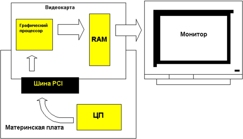 Le schéma général du fonctionnement d'une carte vidéo dans un ordinateur prévoit les actions suivantes.