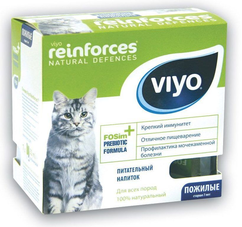 La boisson est conçue pour les animaux de compagnie âgés de plus de 7 ans ; il contient des fibres de fructo-oligosaccharides et d'insuline, qui augmentent le nombre de bactéries bénéfiques dans les intestins. De plus, Viyo Reinforces Cat Senior contient des oméga-6 et oméga-3, du manganèse, du fer, du calcium, du cuivre, de la vitamine B1, B2 et B6.