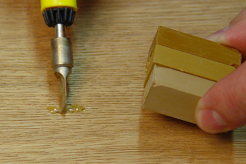 Avant l'application, faites fondre une petite quantité de cire avec un fer à souder et remplissez-la d'un éclat ou d'une fissure. Après refroidissement et durcissement de la cire, retirer l'excédent.