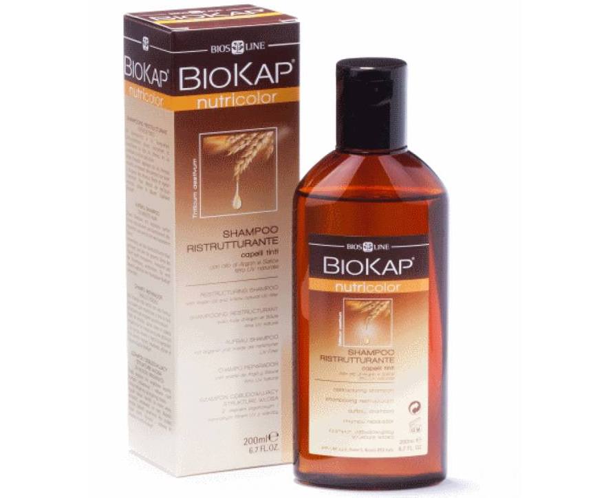 Shampooing BioKap Ristrutturante pour boucles colorées et éclaircies avec la fonctionnalité supplémentaire de récupération après une permanente. La formule spéciale comprend des végétaux, des tensioactifs et nettoie délicatement et en douceur le cuir chevelu et les cheveux eux-mêmes.
