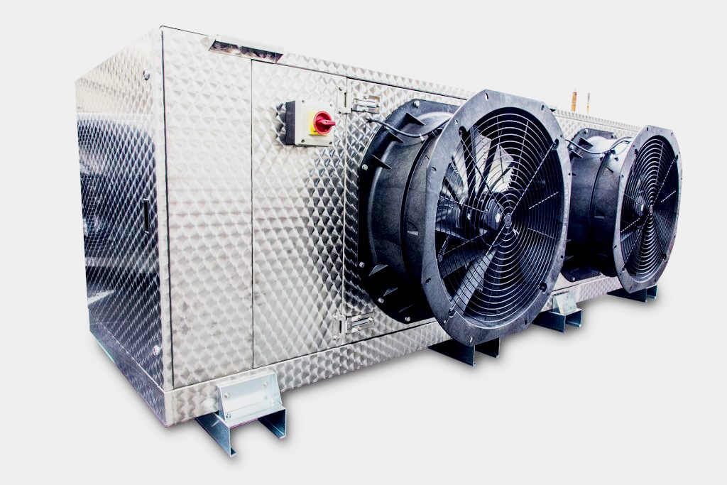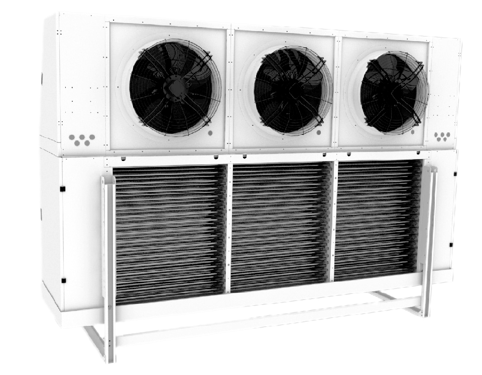 Conception de type eau, qui sert à refroidir les masses d'air et autres mélanges gazeux non explosifs (non fibreux, non collant). De plus, la composition ne doit pas contenir de substances abrasives dures ni d'impuretés. L'installation est réalisée dans des canaux de section rectangulaire. Le R407C et le R22 peuvent être utilisés comme substance principale. La température d'évaporation recommandée est de +5°C.