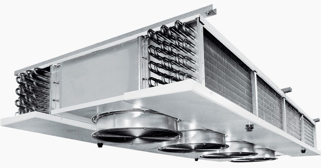 Un dispositif de type à eau qui peut être monté dans des canaux rectangulaires. Des lamelles (plaques d'aluminium) d'une épaisseur de 0,2 mm sont utilisées pour la fabrication du boîtier. L'espace d'emboîtement est de 2,5 mm. Des tubes de 9,52 mm les traversent. Il convient de noter que le fabricant a placé les tubes en damier. Pour une élimination rapide de l'humidité, le système est équipé d'un plateau spécial et d'une buse avec un capteur de gouttes. Il est recommandé d'utiliser des mélanges qui ne gèlent pas. Cependant, l'eau peut également être utilisée. Le refroidisseur d'air de forme rectangulaire est considéré comme efficace, en raison de l'échangeur de chaleur à plaques en cuivre-aluminium, qui a une conception à trois rangées. Ce type de luminaire est souvent utilisé dans les conduits de ventilation.