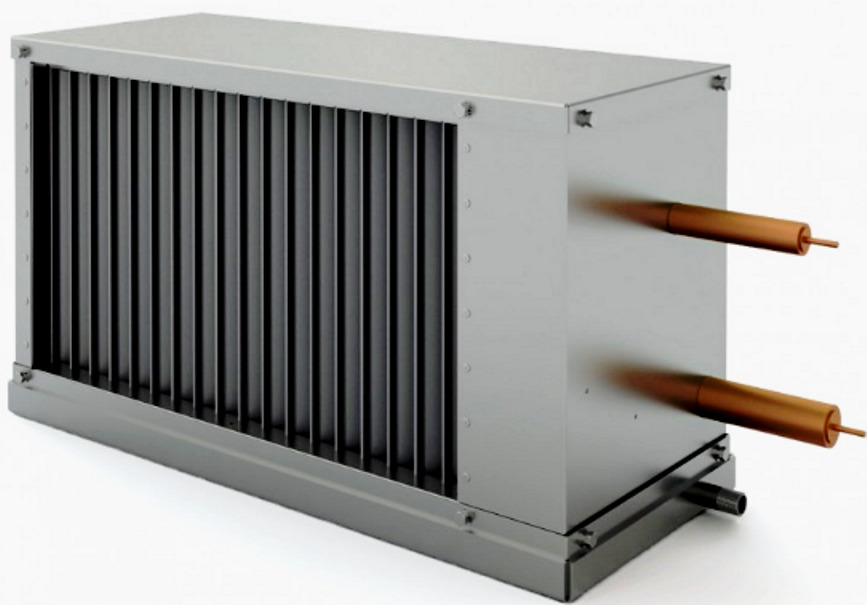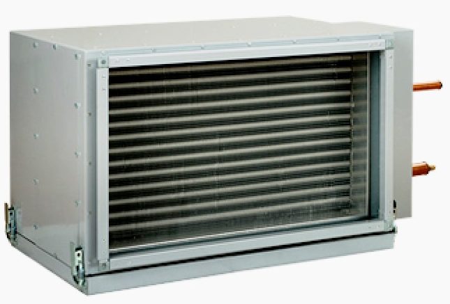 Il est monté directement dans des gaines de ventilation à section rectangulaire. Il est recommandé pour l'agencement de bâtiments et de structures industriels, publics et résidentiels qui nécessitent un refroidissement forcé des masses d'air fournies. Le boîtier est en acier galvanisé à haute résistance (tôle). L'échangeur de chaleur est fabriqué selon la technologie standard dans une version à trois rangées. Les ailettes ont un pas de 2,1 mm, ce qui a permis d'optimiser les indicateurs de poids et de taille et d'augmenter le transfert de chaleur dans des conditions de résistance insignifiante (aérodynamique). L'approvisionnement en matériel est standard.