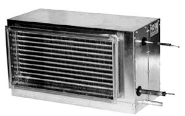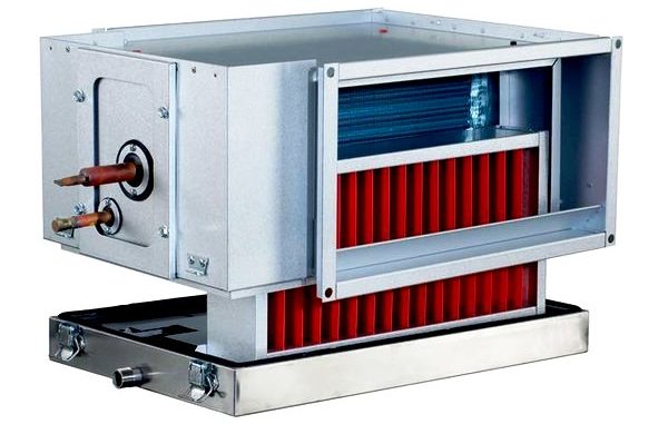 Il est utilisé pour le refroidissement des masses d'air dans les systèmes à section rectangulaire. Pour la fabrication du boîtier, on utilise de la tôle d'acier recouverte d'une couche protectrice de zinc. À l'intérieur se trouve un échangeur de chaleur composé de nombreux tubes en cuivre avec des ailettes en aluminium, ainsi qu'un séparateur de gouttelettes et un bac de récupération. Les ailettes ont un pas de 2,5 mm. Il y a des brides auxiliaires des deux côtés du corps.Avec leur aide, des éléments supplémentaires de ventilation par conduit sont attachés. Le condensat sort par un tuyau galvanisé, qui se présente sous la forme d'un tuyau de dérivation. Son filetage est de ½. La pression admissible à l'intérieur du système est de 3,0 MPa. Lors de la production, la structure est testée dans des conditions de 3,3 MPa.