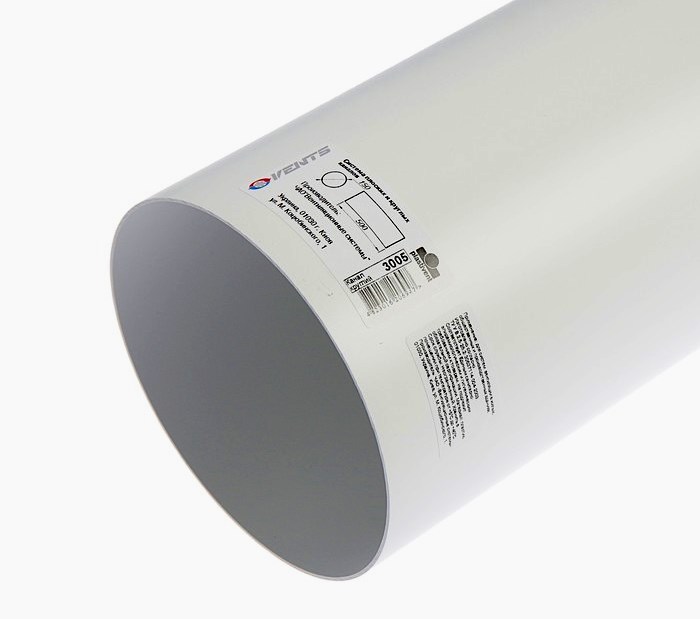 Éléments en plastique à section ronde, utilisés pour équiper les systèmes de ventilation dans les pièces de taille moyenne et petite.De plus, à l'aide du modèle Vents 3005, vous pouvez connecter une hotte aspirante dans la cuisine. Pour la connexion, des éléments auxiliaires d'un diamètre de 100-200 mm seront nécessaires. Le fabricant utilise du PVC blanc comme matériau principal. Il a une longueur de 0,5 m et le diamètre de la partie extérieure est de 153 mm. Diamètre intérieur - 150 mm.