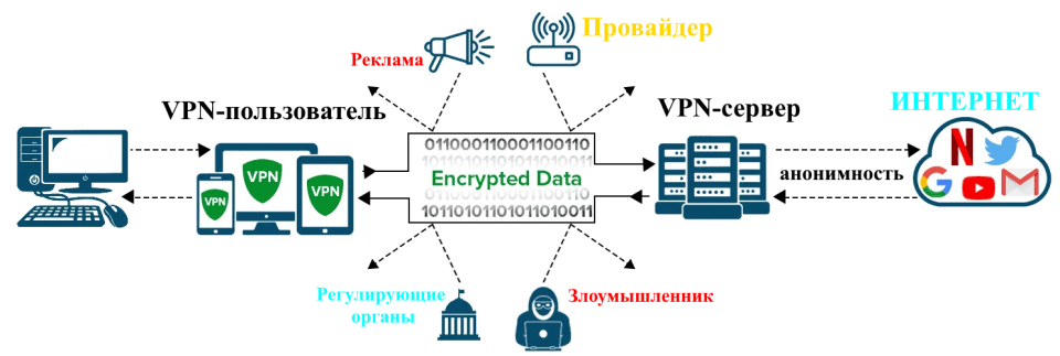 Lorsque la fonction VPN est lancée, le trafic est crypté et envoyé vers un serveur situé n'importe où dans le monde. Par conséquent, l'emplacement et l'adresse IP réelle ne sont pas visibles pour le FAI, mais l'adresse du réseau virtuel est affichée à la place. Ensuite, le trafic est dirigé vers l'application ou le site souhaité, qui "voit" un tel serveur comme une source. Cela crée la possibilité :