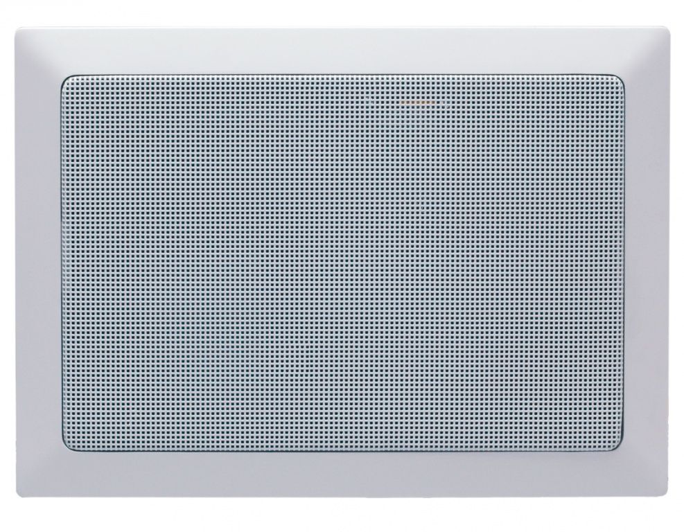 L'appareil est de type fermé en plastique, tandis que les haut-parleurs sont recouverts d'une grille en aluminium, ce qui est rare dans un tel équipement. Une profondeur d'installation de 60 mm vous permet d'installer le panneau non seulement dans le mur, mais également dans le plafond. La fixation sur une surface fixe s'effectue à l'aide d'un raccord vissé (4 pièces).