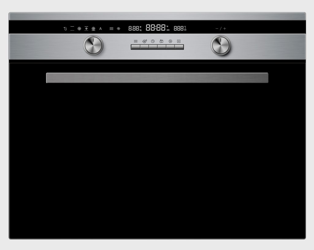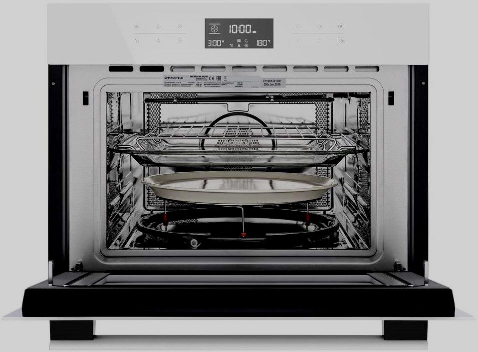 Un excellent modèle deux en un qui s'intégrera dans n'importe quelle cuisine. C'est cette conception qu'il est recommandé d'acheter pour une petite pièce en présence d'un espace limité. Il existe 13 programmes de cuisson prédéfinis et neuf modes de fonctionnement. Le fabricant a utilisé un type de contrôle tactile. La structure est en acier inoxydable et a une finition lisse. L'intérieur est illuminé. Il y a aussi une horloge, une minuterie et une serrure de porte. Dans le kit, vous pouvez également trouver une grille de cuisson (carrée), un plateau en verre, un anneau rotatif, un émail et un plateau en céramique.