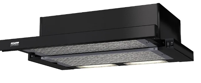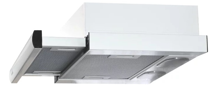 Hotte aspirante avec commande mécanique, glissière, mécanisme télescopique et éclairage halogène, adaptée aux cuisines de toutes tailles. Il est équipé d'un moteur puissant qui fonctionne en plusieurs modes. Le cadre est en acier inoxydable, peint en peinture inoffensive. Le modèle fonctionne selon plusieurs modes, a différentes vitesses et est monté dans une armoire.