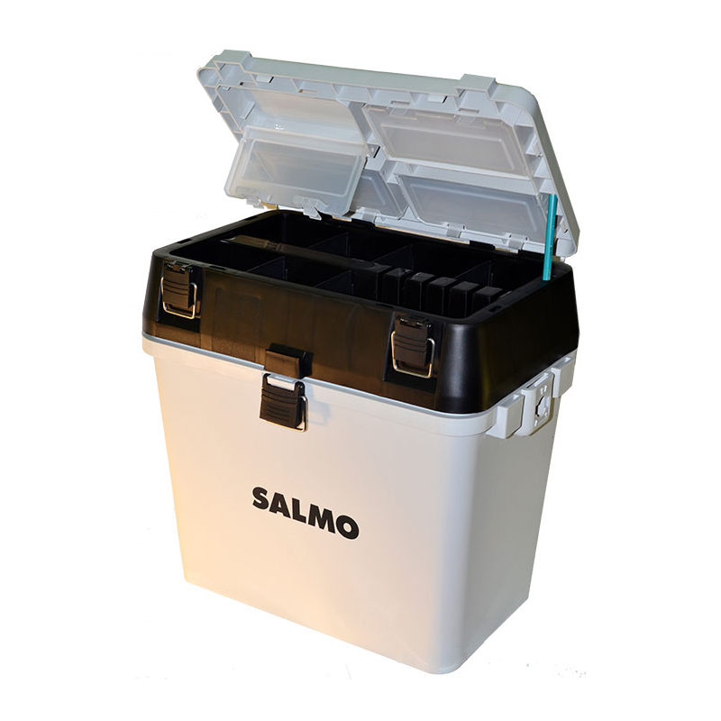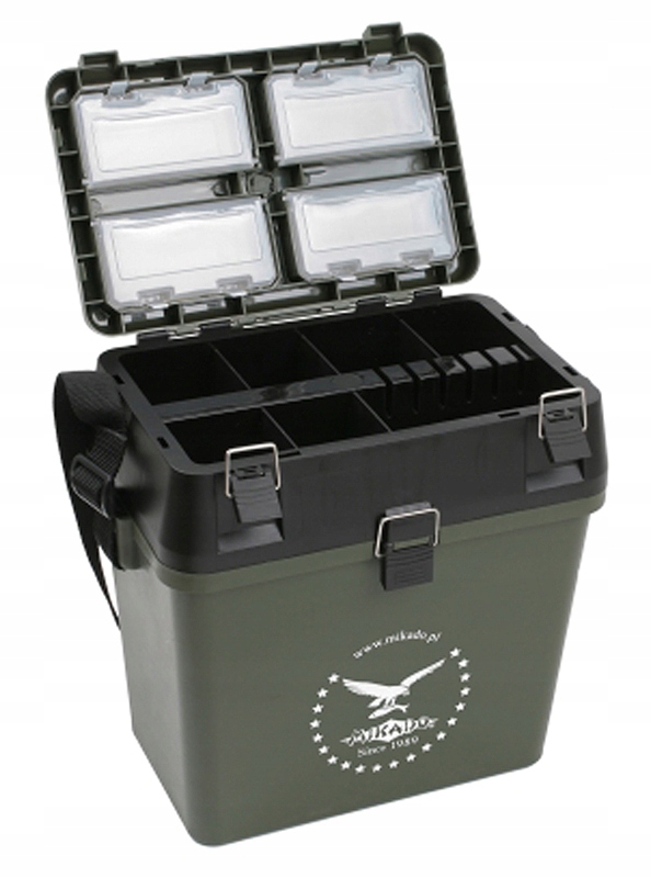 Nous présentons à votre attention un produit de production polonaise. Pratique et pratique à utiliser, la box servira longtemps son propriétaire. Il peut transporter non seulement des accessoires de pêche, mais également des accessoires auxiliaires. L'ensemble de l'espace est divisé en plusieurs compartiments. Celui du bas offre un stockage pour les stocks de grande taille et celui du haut pour les stocks de petite taille. Le couvercle se ferme avec deux serrures - loquets.