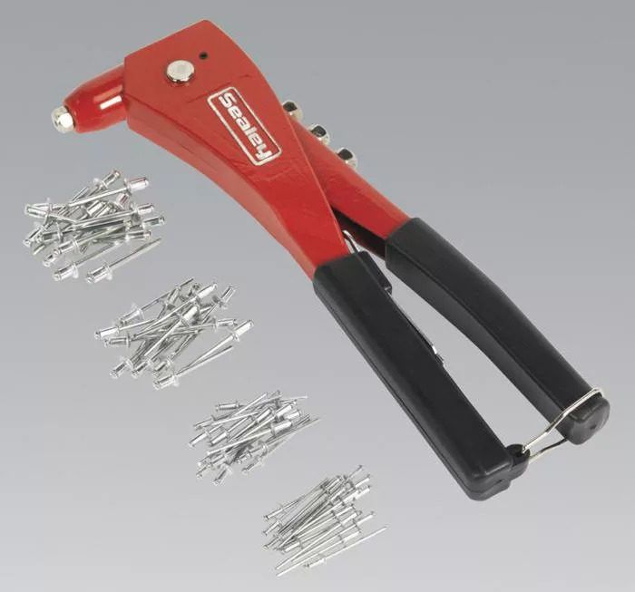 La riveteuse à levier est conçue pour des charges élevées. La poignée est équipée d'un limiteur spécial, entouré de caoutchouc d'une composition complexe pour un ajustement ferme dans la main. L'avantage de ce modèle est que l'utilisateur peut agrafer par l'extrémité plutôt que des deux côtés. Le mécanisme de pression est conçu de telle manière qu'un petit effort suffit pour fabriquer un trombone fiable. Le corps est moulé en aluminium, ce qui confère à l'outil une longue durée de vie.
