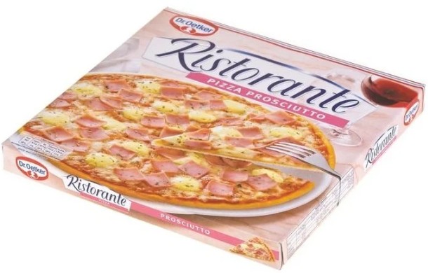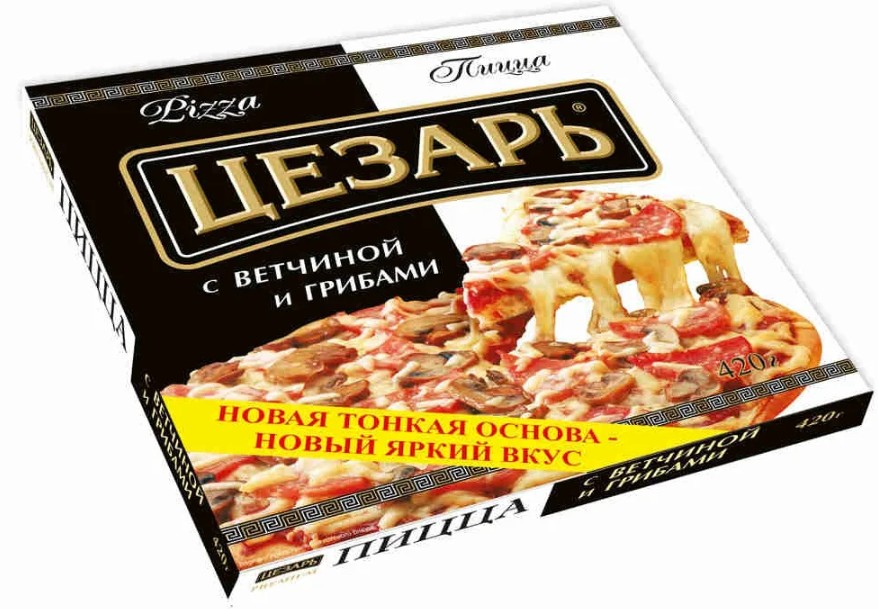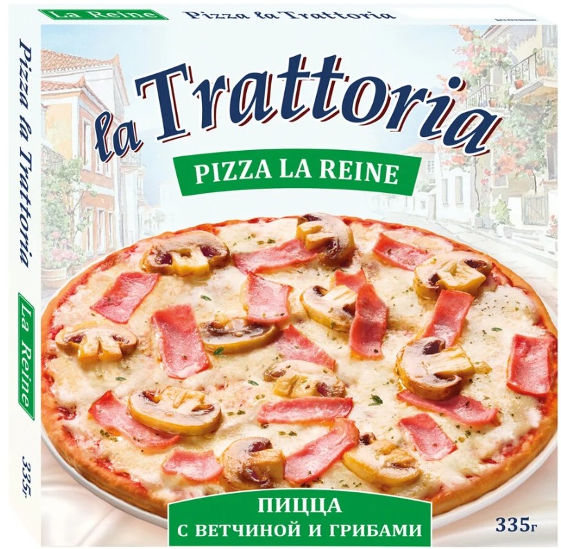 Base surgelée avec des tranches de jambon et des morceaux de champignons répartis uniformément sur une croûte mince.Le gâteau lui-même est cuit sur un feu ouvert. La base est uniformément enduite d'une couche de purée de tomates. Du jambon de porc, 2 types de fromage, des champignons et des assaisonnements sont ajoutés comme garniture.