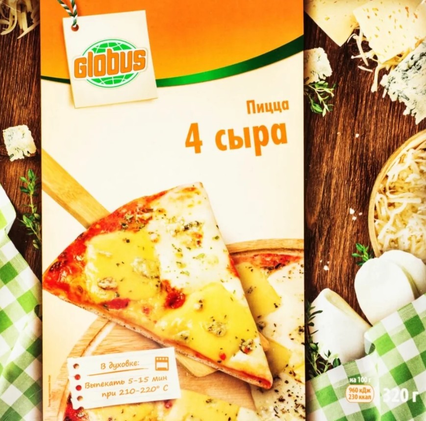 Dans la pizza Globus, la pâte fine est recouverte de purée de tomates avec des épices parfumées et des légumes verts sophistiqués. Pour la garniture, 4 types de fromages naturels sont utilisés. Poids : 320 grammes.