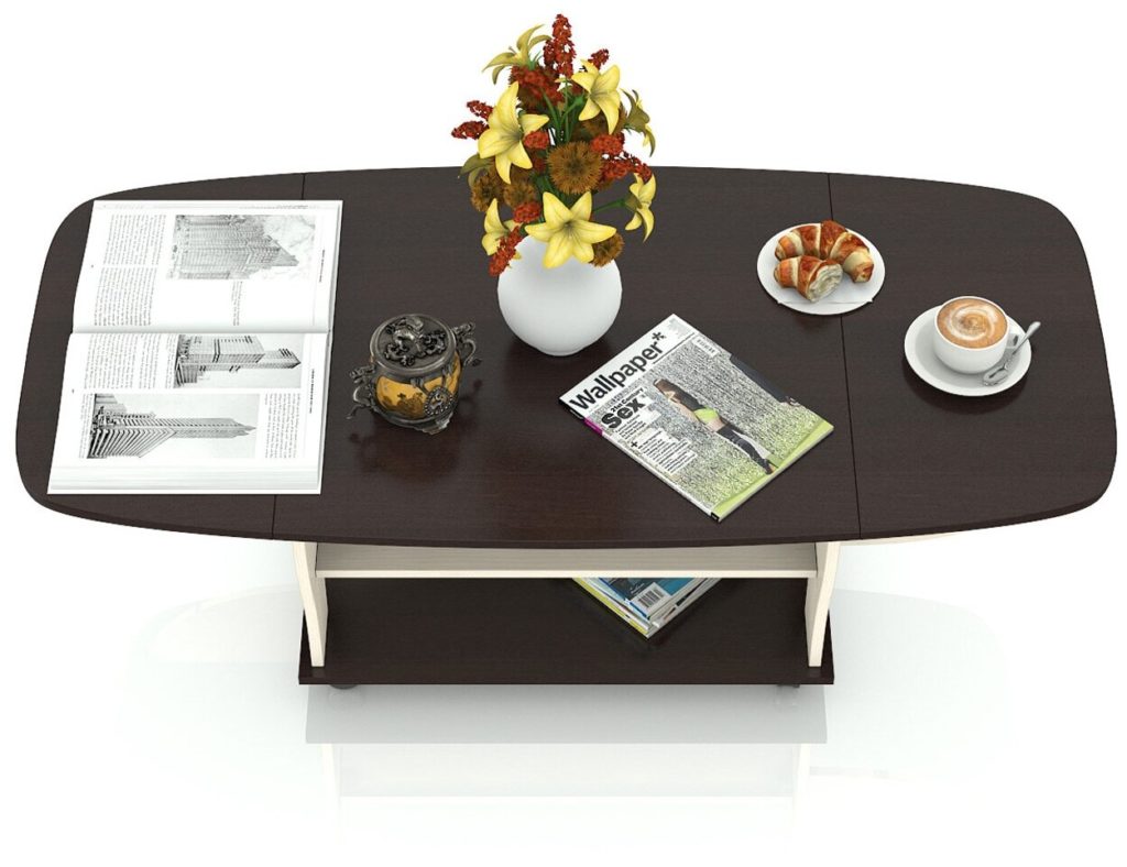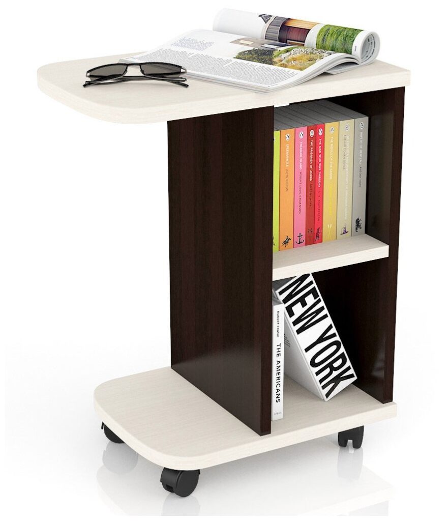 Une table compacte aux couleurs wengé/chêne est équipée d'étagères confortables où vous pouvez ranger des livres, des magazines ou diverses petites choses. Producteur - Usine russe Mebelny Dvor. Dimensions 47 x 30 x 60 cm Fabriqué en aggloméré.