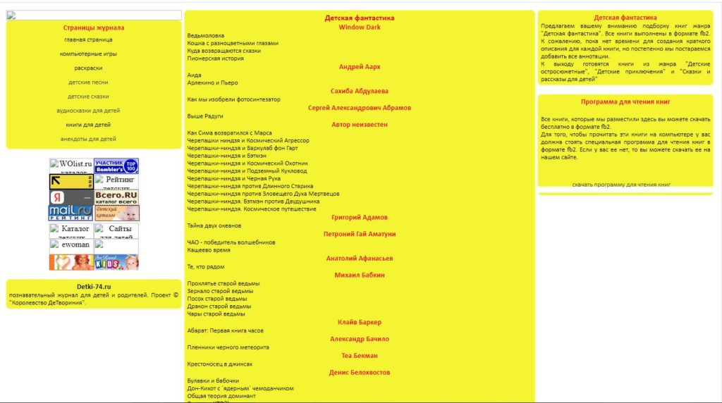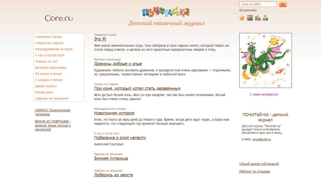 Le magazine électronique gratuit propose à ses lecteurs des contes de fées et des chansons, des livres à colorier et des jeux informatiques.Une page séparée est consacrée au théâtre de chat de Yuri Kuklachev. Lors de la préparation des documents, les éditeurs sont guidés par les commentaires des lecteurs qui écrivent pour quels enfants d'âge ils aimeraient voir de nouveaux articles et jeux.