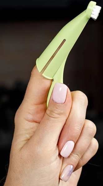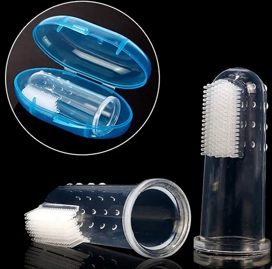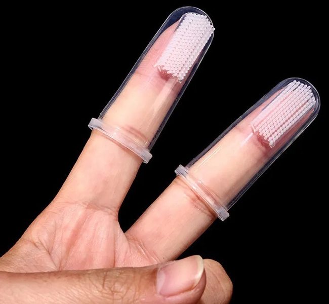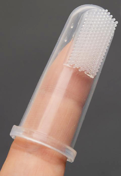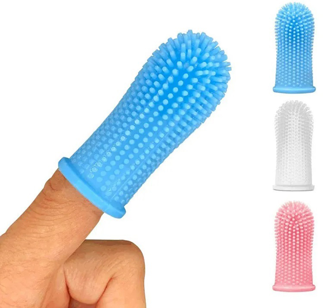 L'une des options les plus pratiques pour le propriétaire et son animal de compagnie est un design simple qui tient sur le doigt. Habituellement, ces produits sont en silicone et ont des poils doux qui ne sont pas capables d'endommager les gencives. De plus, il est pratique de travailler avec un tel objet, cela vous permet de contrôler plus précisément vos actions.
