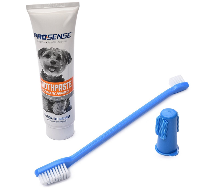 Ensemble de soins bucco-dentaires composé d'un dentifrice, d'une brosse classique et d'un bout des doigts. La pâte est absolument sans danger, elle ne nuira pas à sa santé même si elle est avalée accidentellement et ne nécessite pas de rinçage après la procédure. Sa composition nettoie efficacement la surface des dents de la plaque, prévient la formation de tartre. Les outils Pro-Sense 8 en 1 conviennent aux petits et grands chiens.La brosse classique a un manche long et confortable. Le bout des doigts vous permet d'accéder à des endroits difficiles d'accès. Les deux produits sont fabriqués en plastique durable et sont disponibles en bleu. Le coût moyen d'un ensemble est de 801 roubles.