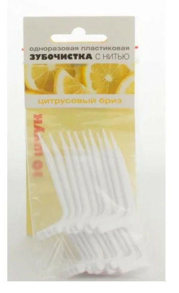 Les cure-dents avec fil sont en plastique vert clair, emballés dans un sac en plastique, qui se ferme hermétiquement grâce à un mécanisme spécial. La tête se plie, vous permet de nettoyer confortablement les dents à mâcher. En raison de son élargissement, il pénètre sous le bord gingival.
