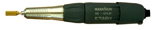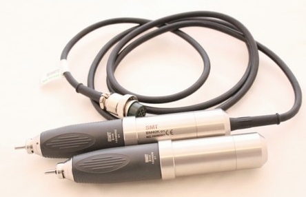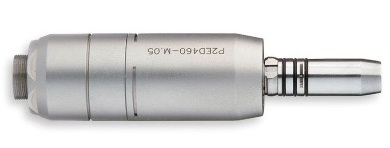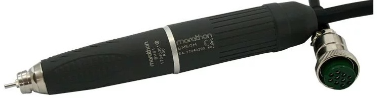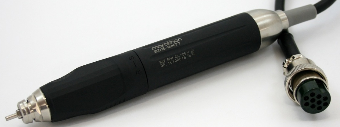 Pièce à main dans un boîtier plastique fin avec inserts métalliques : tête, partie arrière de la structure, fiche de raccordement (partie supérieure). La moitié du micromoteur est de structure droite, l'autre moitié (plus proche de la pointe) est de forme ergonomique rétrécie. Compatible avec les boîtiers de contrôle comme "SDE-BM50M/BHS1".