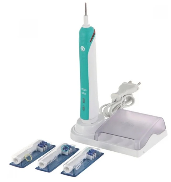 Un ensemble de trois accessoires avec un chargeur portable. Il a un étui pour le stockage et le transfert, un support avec un support pour des accessoires supplémentaires. L'indication de la charge de la batterie et de l'usure des poils de la brosse vous informe respectivement de la recharge / du remplacement en temps opportun. Il y a un capteur de pression sur la dent, ainsi qu'une fonction de réglage de la minuterie. Selon la tête installée, les vibrations sonores sont comptées.