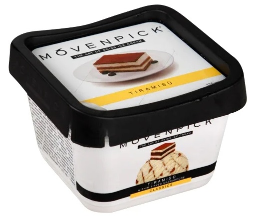 Movenpick Tiramisu est livré dans un seau en plastique. Son poids est de 810 grammes. 100 grammes du produit contiennent 147 kcal. La teneur en matières grasses du produit est de 15,5%