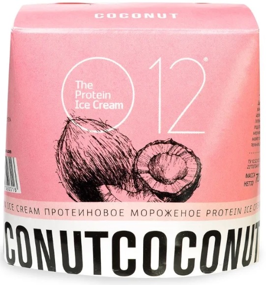 "O12 noix de coco" a un emballage en papier, le poids d'une portion est de 70 grammes. 100 de ces glaces contiennent 136 kcal.