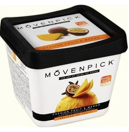 Movenpick Mango Passion Fruit est livré dans un récipient en plastique et pèse 900 grammes.100 grammes du produit contiennent 132 kcal et la teneur en matières grasses est de 0,2 %.