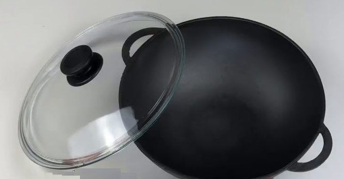 Corps en fonte durcie de la poêle wok, résistant à divers dommages et ne craignant pas les températures élevées. Une forme conique d'un diamètre de 28 cm et un fond plat épais - 17 cm chauffent les aliments uniformément et le plat est prêt presque instantanément.