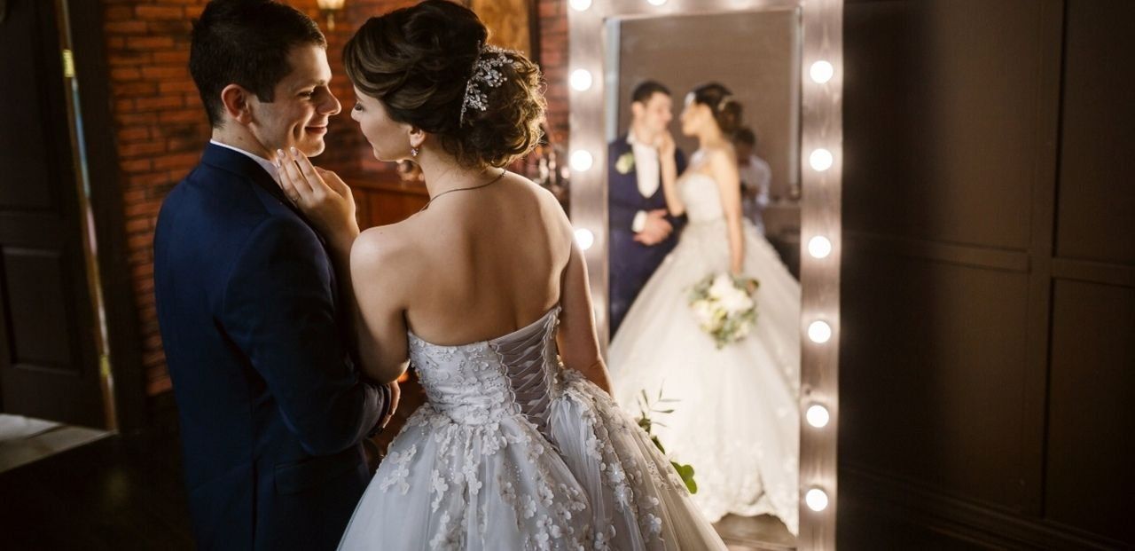Il y a de grandes fenêtres dans les couloirs du studio photo à travers lesquelles beaucoup de lumière solaire pénètre dans la pièce. Le studio est incroyable pour une séance photo de mariage.