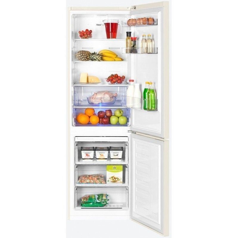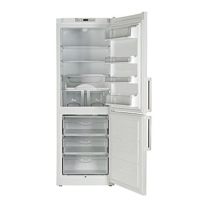 Modèle blanc article 6321 pour 2 chambres avec un congélateur en bas. Nombre d'éléments : 3 tiroirs de congélation, 4 étagères en verre réglables, deux tiroirs profonds et 4 vide-poches de porte, un plateau pour une douzaine d'œufs. Les portes avec deux poignées attachées s'ouvrent à la fois vers la droite et vers la gauche, en fonction de leur auvent.