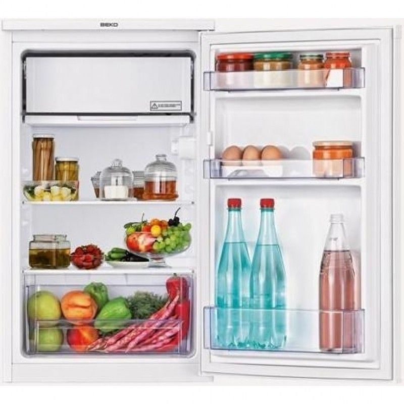 Petit réfrigérateur article 190320 pour deux chambres avec une porte et poignées cachées pour l'ouvrir. Le congélateur est en haut. Il y a 2 étagères en verre réarrangées, 2 tiroirs pour les légumes et les fruits et trois poches de porte. Petit plateau à œufs pouvant contenir jusqu'à 6 œufs La porte est installée de n'importe quel côté. Couleur blanche.