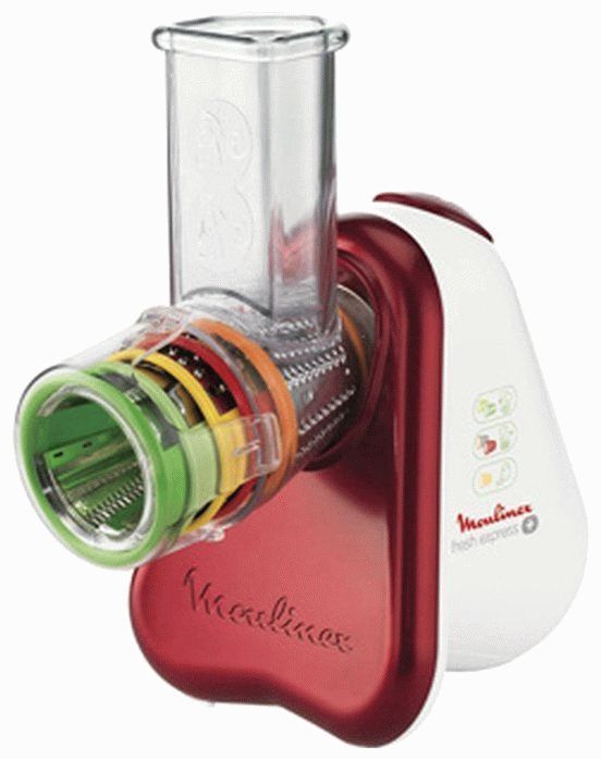 Broyeur-râpe compact avec cinq accessoires différents. Le principe de fonctionnement est simple: la buse souhaitée est insérée, les produits sont introduits dans le tuyau avec un trou sur le dessus, la sortie est un produit broyé.