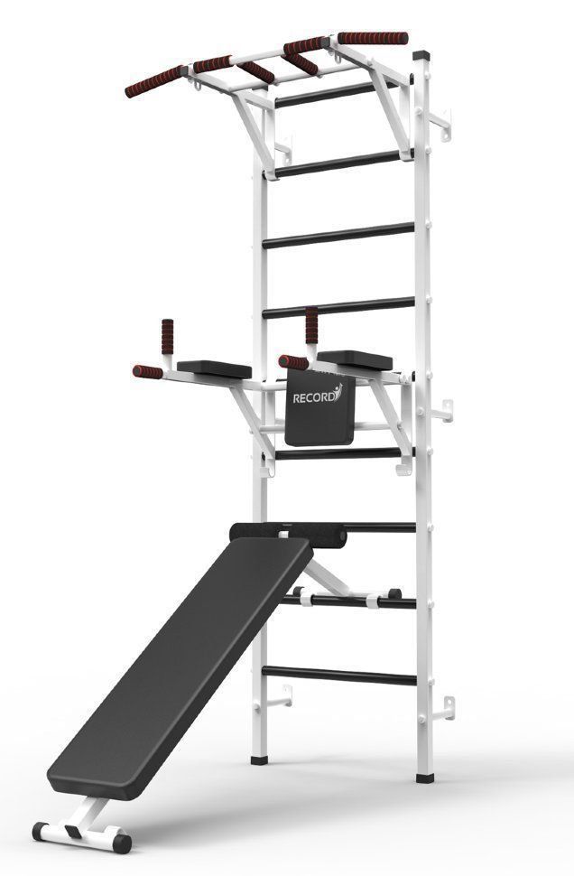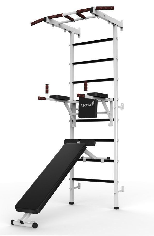 Ensemble complet : barre horizontale avec poignées pour toute prise, réglable en hauteur.Simulateur monté, composé de barres, d'un accent pour la barre et d'un entraînement de presse. Banc pour abdominaux, développé couché et autres exercices.