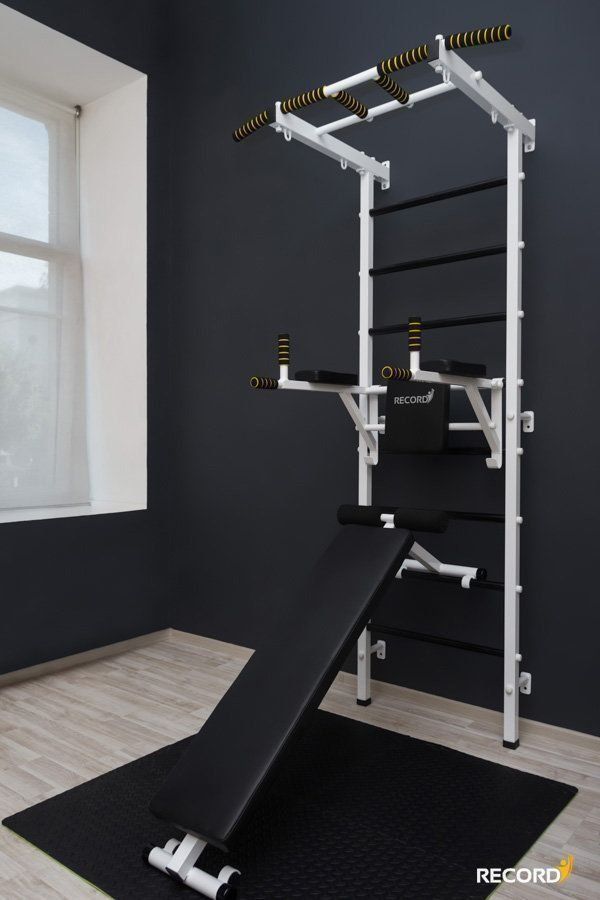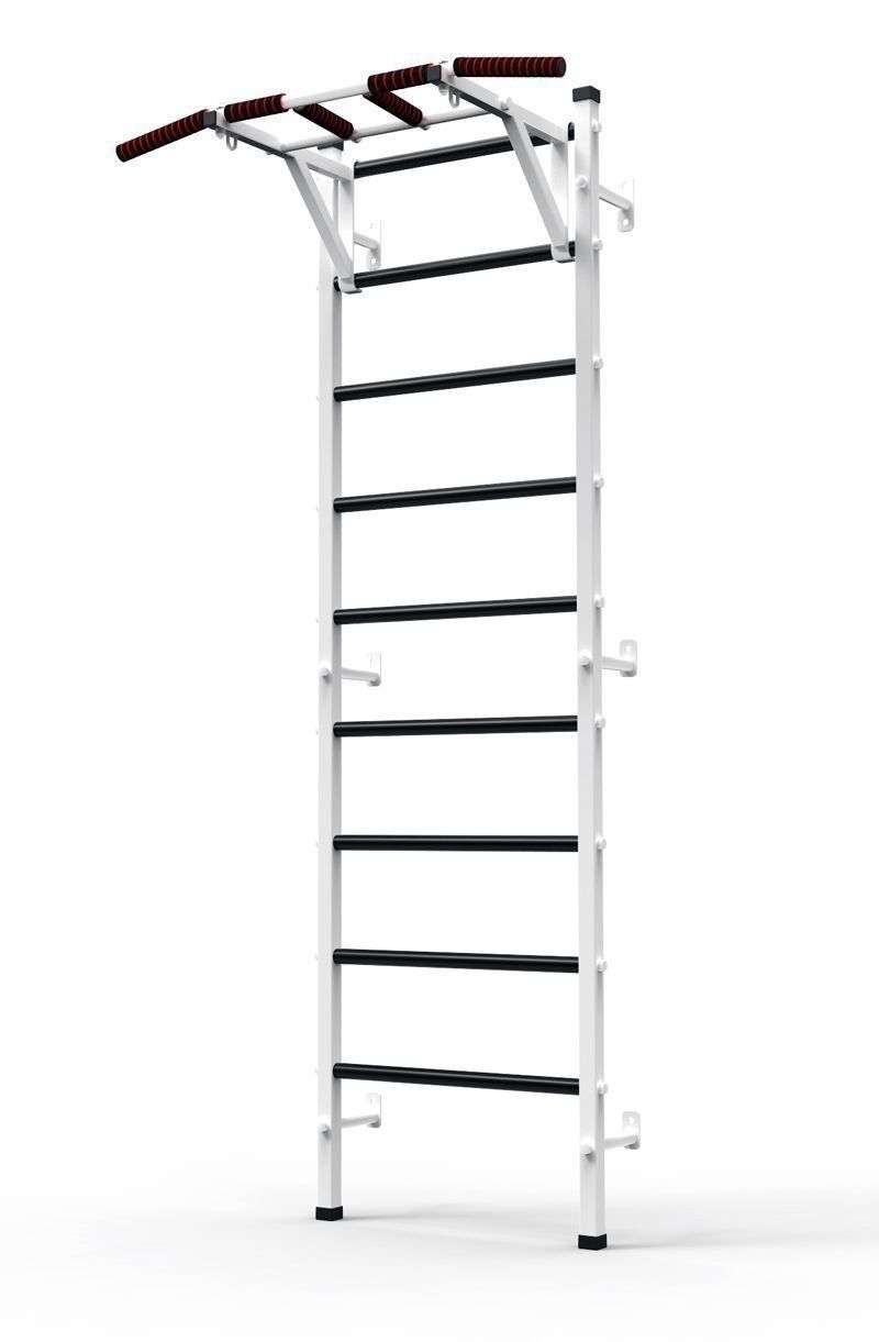 Composants : mur suédois avec un simulateur de dos (barres et un accent pour la barre), une barre horizontale articulée (réglable en hauteur, pour une prise moyenne, étroite et large).
