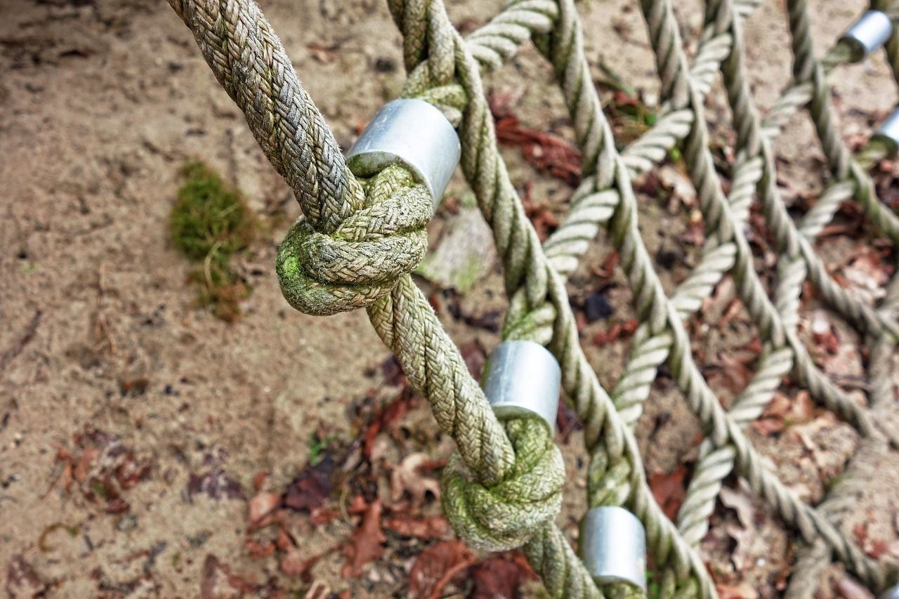 Les éléments constitutifs du complexe : des barres horizontales entretoises entre le sol et le plafond, des anneaux de gymnastique, une corde et une échelle de corde.