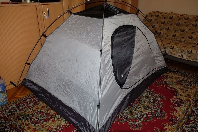 Cette tente est également conçue pour le camping.C'est suffisant pour une famille, car il est conçu pour trois personnes. Cela coûte 3000 roubles. Pèse 3,75 kg. Fabriqué en République tchèque. Les racks sont fabriqués dans un matériau durable.