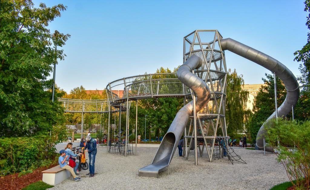La conception de la ville fantastique est une tour de conte de fées à trois niveaux. Sa hauteur dans la partie la plus haute est de 7 m.Comme éléments de jeu, une rampe-tuyau, un mur d'escalade, un toboggan pour les enfants et un panneau interactif en forme d'engrenage sont fournis.